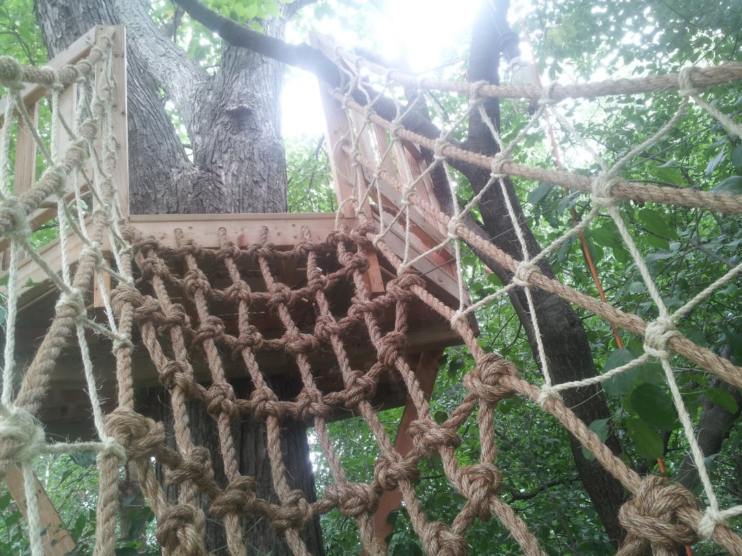 A total of 14 lengths of 1" manila rope run from the fort to the treehouse and weave together to form our bridge. I hand tied every one of the 60 sheet bends, 66 hitches and 12 arbor knots. It used approximately 250' of 1" rope and 150' of 1/4" rope.